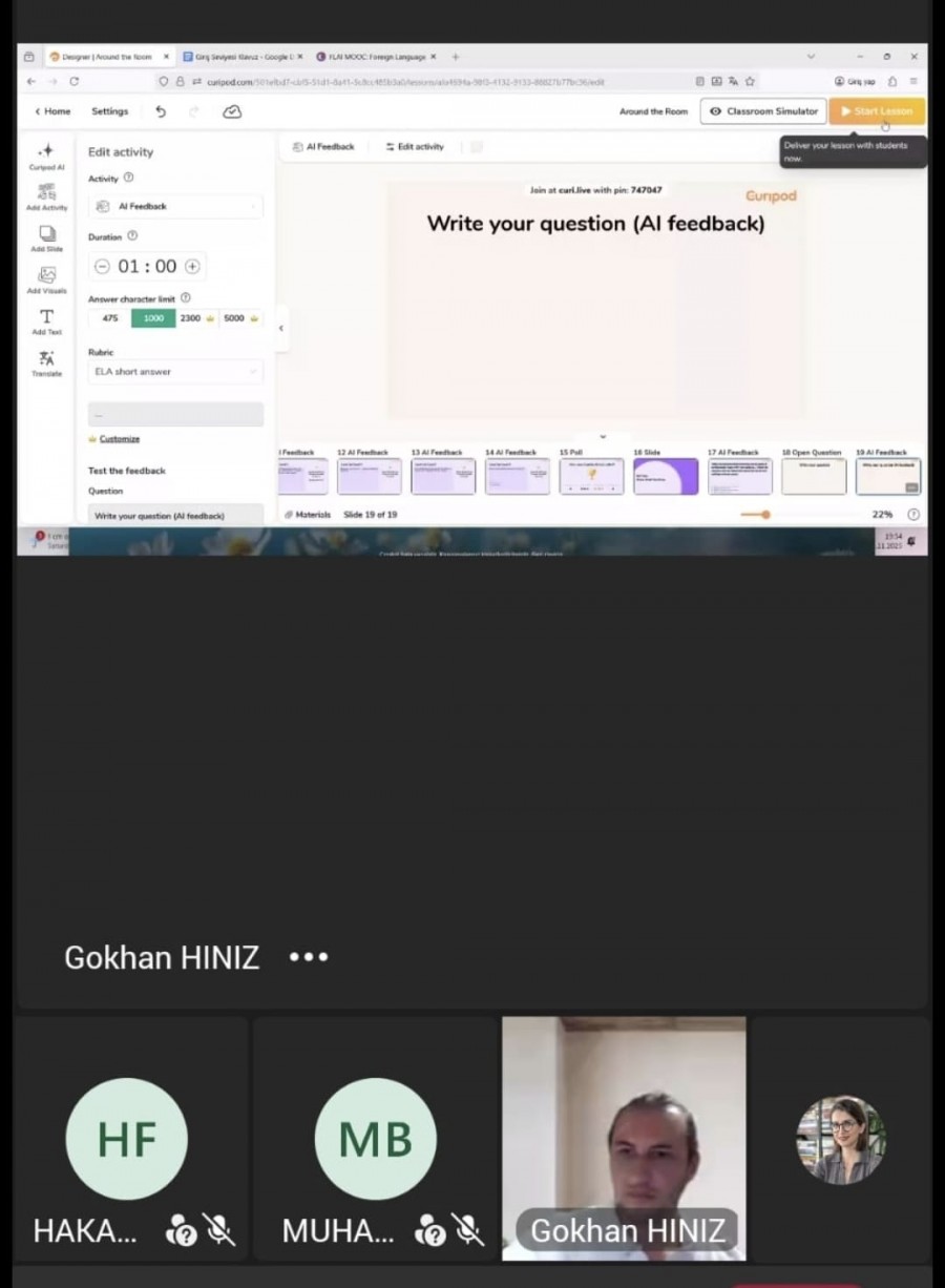 Yabancı Diller Yüksekokulu Müdür Yardımcısı ve Mesleki Gelişim Koordinatörü Öğr. Gör. Dr. Gökhan Hınız, Karadeniz Teknik Üniversitesi’nde çevrimiçi olarak “Eğitimde Yapay Zekâ Uygulamaları” başlıklı bir eğitim verdi.